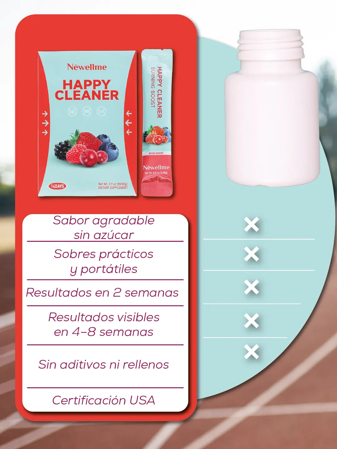 Newellme Happy Cleaner combina probióticos, prebióticos y fibra orgánica para restaurar tu flora intestinal, reducir la hinchazón y mantener tu vientre plano sin necesidad de dietas extremas ni sacrificios.